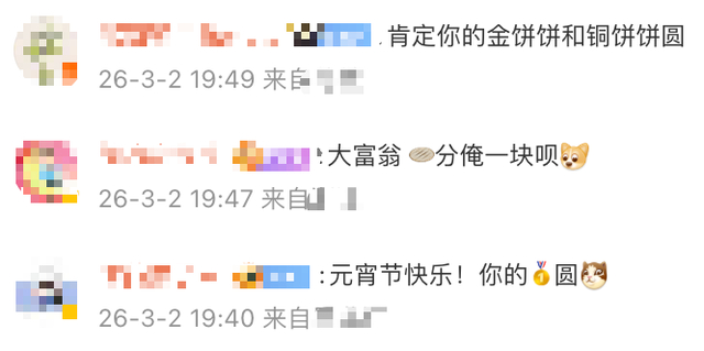 网友们嗨皮回应:“十五的月亮十六圆,所以你的金牌(更)圆。”